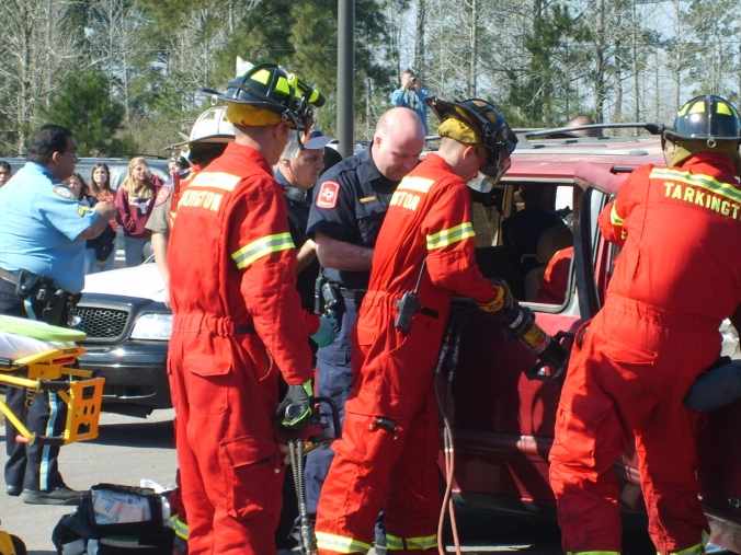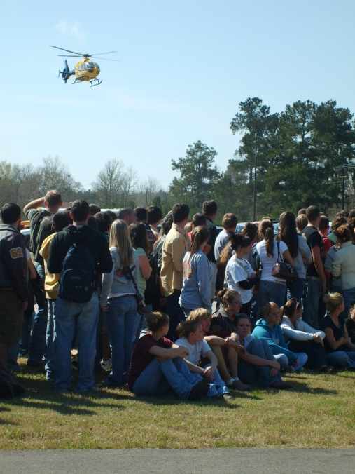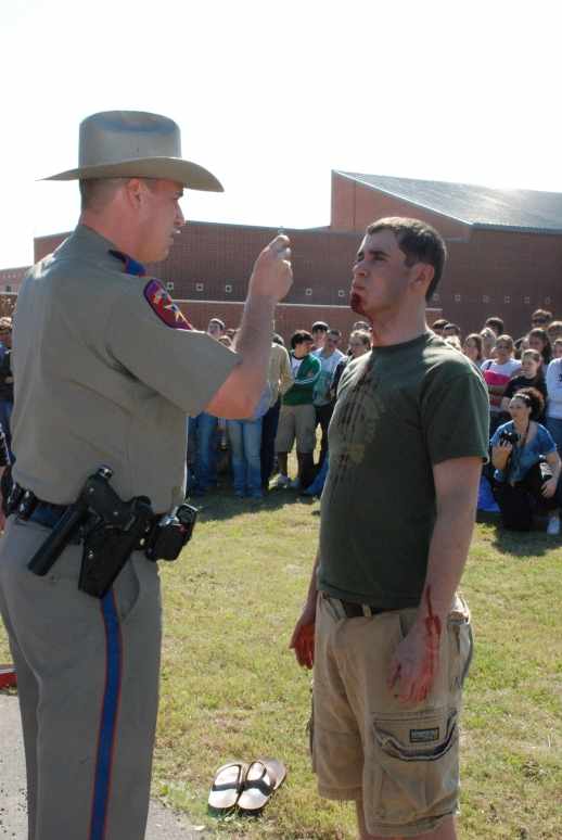 The major event of the day is the mock accident. The junior and senior classes are brought out to witness a staged accident involving a "drunk" driver. This accident involves several students, fire, emergency medical service, law enforcement, towing company, air medical, and funeral home personal in a scenario that recreates what happens in an actual accident. At least one student is flown by helicopter from the scene and another is pronounced dead and placed into a body bag. Other students are taken away by ground ambulance, while the "drunk" driver is given a field sobriety test and arrested.